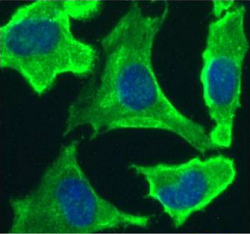 Immunofluorescenct staining of Hela cells with EGFR recombinant monoclonal antibody, clone 528 (Cat # RAB03426).
