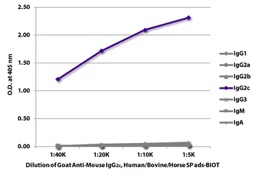 Goat Anti-Mouse IgG2c (Heavy chain) antibody, pre-adsorbed (Biotin) Cat. No. GTX04208-02 Cat. No. GTX04208-02 GTX04208-02 ELISA Image ELISA analysis of purified mouse immunoglobulins using serially diluted GTX04208-02 Goat Anti-Mouse IgG2c (Heavy chain) antibody, pre-adsorbed (Biotin) followed by Streptavidin (HRP). See all Mouse IgG products