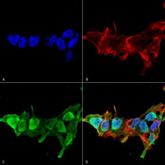 Immunocytochemical staining of SK-N-BE with Mfn2 monoclonal antibody, clone S153-5 (ATTO 390) (Cat # MAB18600). (A) DAPI (blue) nuclear stain (B) Phalloidin Texas Red F-Actin stain (C) Mfn2 Antibody and (D) Composite.Western Blot (Tissue lysate)