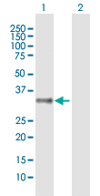 Western Blot analysis of MRGPRX2 expression in transfected 293T cell line (H00117194-T04) by MRGPRX2 MaxPab polyclonal antibody.