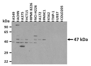 WB analysis of various sample lysates using GTX04103 POU2F3 antibody.