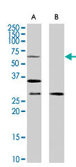 PRPF31 polyclonal antibody (Cat # PAB7154) (1 ug/mL) staining of HeLa cell lysate (35 ug protein in RIPA buffer) with (B) and without (A) blocking with the immunising peptide. Primary incubation was 1 hour. Detected by chemiluminescence. - Gene Info — PRPF31