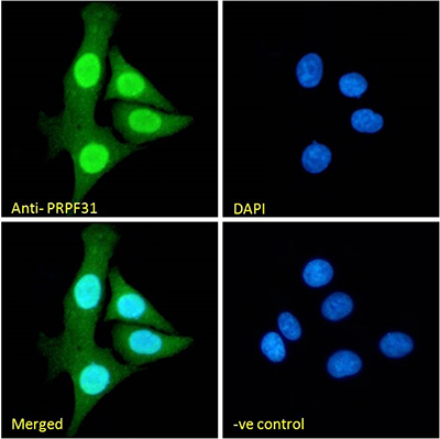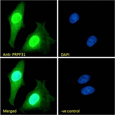 PRPF31 polyclonal antibody (Cat # PAB7154) Immunofluorescence analysis of paraformaldehyde fixed HEK293 cells, permeabilized with 0.15% Triton. Primary incubation 1hr (10 ug/mL) followed by Alexa Fluor 488 secondary antibody (2 ug/mL), showing strong nuclear and weak cytoplasmic staining. The nuclear stain is DAPI (blue). Negative control: Unimmunized goat IgG (10 ug/mL) followed by Alexa Fluor 488 secondary antibody (2 ug/mL).Immunofluorescence