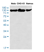 Western blot analysis of Rad21 in Hela, CHO-K1, Ramos lysates using Rad21 antibody. - Gene Info — RAD21