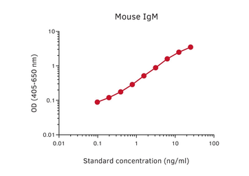 Sandwich ELISA analysis of mouse IgM protein using GTX03031 Rat anti-Mouse IgM antibody [MT6A3] as coating antibody and GTX03032-02 Rat anti-Mouse IgM antibody [MT9A2] (Biotin) as detecting antibody.