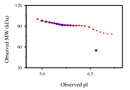 | Symansis' purified IL-2 R gamma - Fc Chimerahcx has N-linked and O-linked oligosaccharides, shown by a drop in observed MW on SDS-PAGE after treatment with PNGase F and a further drop in observed MW on SDS-PAGE after treatment with a glycosidase cocktail. Symansis' IL-2 R gamma - Fc Chimerahcx consists of 25-50% carbohydrate by weight. Densitometry of protein isoforms visualised by 2-DE. Spot trains are normal in human proteins and highlight the presence of multiple isoforms which differ according to their level of post-translational modification. The triangle indicates the theoretical MW and pI of the protein. 1D SDS-PAGE of Symansis' hcx protein before and after treatment with glycosidases to remove oligosaccharides. A drop in the observed MW after treatment indicates the presence of glycosylation. 1. Ginn SL, et al. (2004) Hum Mutat. 23: 522-3. | ![]() | ![]() |