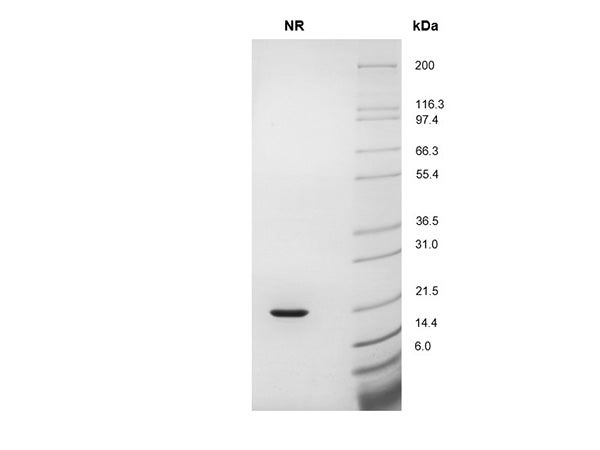 Figure 1. rh IL-6 (1 μg) was resolved withSDS-PAGE under non-reducing(NR) conditions and visualized byInstantBlue staining showing asingle prominent band at 20.9 kDa.
