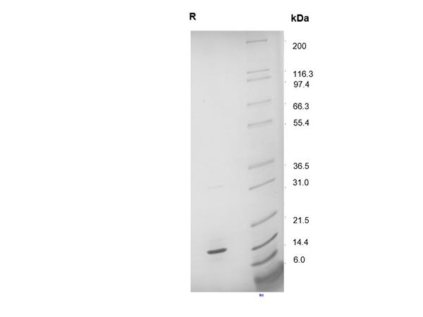 Figure 1. rh SCF (1 μg) was resolved with SDS-PAGE under reducing (R) conditions and visualized by InstantBlue staining showing a prominent band at ~15 kDa.*