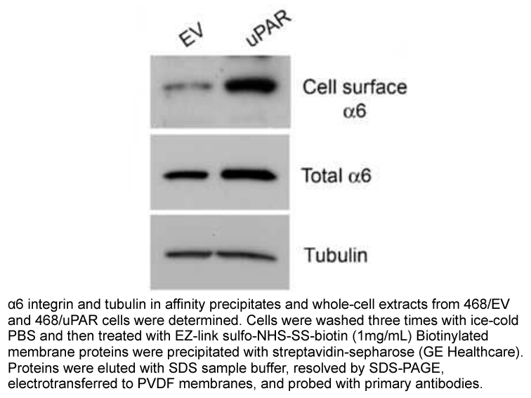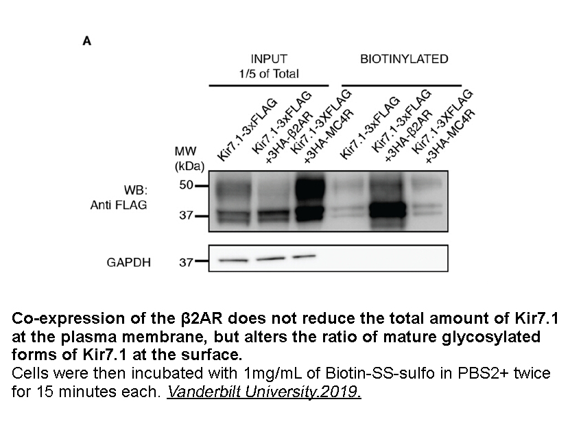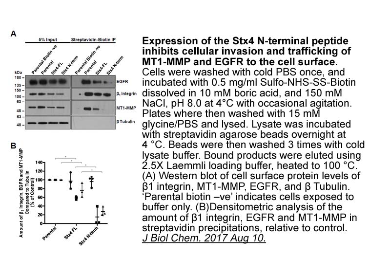 | Applications | Cells in monolayer culture (1.5 × 106) were washed three times with ice-cold PBS and then treated with sulfo-NHS-SS-biotin (1mg/mL) for 15 minutes on ice. Biotinylation reactions were terminated with 100 mmol/L glycine in PBS. After washing with PBS, cell extracts were prepared in radioimmunoprecipitation assay (RIPA) buffer (20 mmol/L sodium phosphate, 150 mmol/L NaCl (pH 7.4), 1% NP40, 0.1% SDS, and 0.5% deoxycholic acid) with protease inhibitor cocktail. Biotinylated membrane proteins were precipitated with streptavidin-sepharose. Proteins were eluted with SDS sample buffer, resolved by SDS-PAGE, electrotransferred to polyvinylidene difluoride (PVDF) membranes, and probed with primary antibodies. |