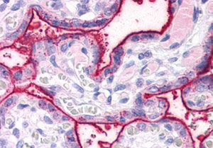Immunohistochemistry (Formalin/PFA-fixed paraffin-embedded sections) of human placenta with SURF4 polyclonal antibody (Cat # PAB28180). Immunohistochemistry of formalin-fixed, paraffin-embedded tissue after heat-induced antigen retrieval.Immunohistochemistry (Formalin/PFA-fixed paraffin-embedded sections)