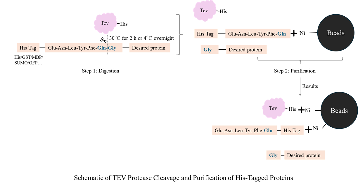 TEV protease is a cysteine protease used to cleave fusion tags from recombinant proteins.It is expressed using an E. coli expression system. It specifically recognizes the amino acid sequence ENLYFQ▼S, but tolerates amino acids G, A, M, C, or H at the P1' position. TEV protease maintains activity in the pH range of 6.0–9.0, with reduced or absent enzyme activity at pH ≤ 5.0, and is often used in affinity purification steps to remove His, GST, or other fusion tags. To maximize protein activity and structure, cleavage reactions are typically performed overnight at 4°C.