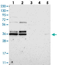 Western blot analysis of Lane 1: RT-4, Lane 2: U-251 MG, Lane 3: Human Plasma, Lane 4: Liver, Lane 5: Tonsil with TMBIM1 polyclonal antibody (Cat # PAB20584). - Gene Info — TMBIM1