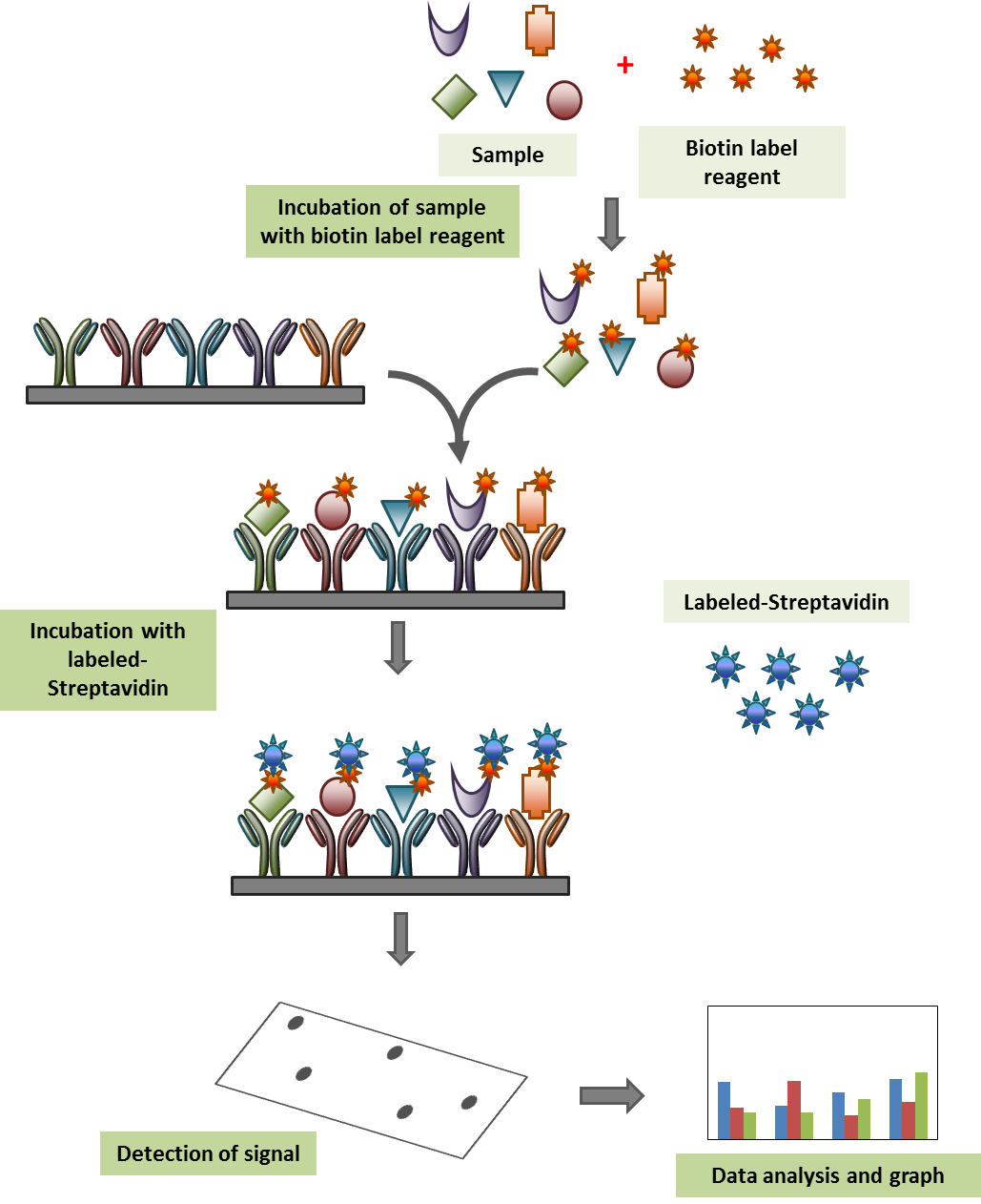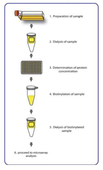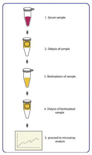 Samples are dialyzed before biotin-labelling step. through a simple process, the primary amine of the proteins in the sample is biotinylated, followed by dialysis to remove free biotin. From here, the newly biotinylated sample is added onto the array membrane or glass slide and incubated at room temperature. After incubation with Streptavidin-conjugated HRP or Streptavidin-conjugated Fluor, the signals can be visualized either by chemiluminescence or fluorescence, respectively. The experimental procedure is simple and can be performed in any laboratory.