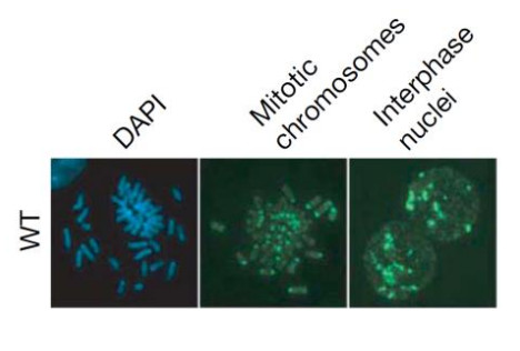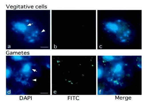 ![]() Methylation of chloroplast DNA of Chlamydomonas me-1 cells, visualized by anti-5-methylcytosine antibodies. Left: DAPI stained cells. Middle: Cells stained with anti-5MeC antibodies, followed by secondary anti-mouse IgM, FITC conjugated secondary antibodies, Right: Merged image. Chloroplast DNA is exclusively methylated in gamete cells. Described in Nishiyama et al. 2002. ![]() Intense 5-methylcytosine staining at pericentromeric regions of mouse embryonic stem cells was seen in the mitotic chromosome and interphase nuclei of ESCs. Described in Sharif et al. 2007. |