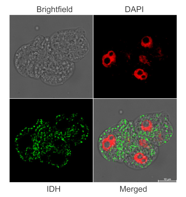 ![]() 20 µg of total protein from Arabidopsis thaliana leaf extract (1), Arabidopsis thaliana fraction enriched with mitochondria (2), Arabidopsis thaliana pure mitochondria (3), Pisum sativum pure mitochondria (4), Solanum tuberosum pure mitochondria (5), were separated on 4-12% SDS-PAGE and blotted to nitrocellulose. Blots were blocked immediately following transfer in 5% milk powder in TBS. Blots were incubated in the primary antibody at a dilution of 1: 5 000 for 1h at room temperature with agitation, followed by an incubation with a secondary antibody and a series of washes. Blots were developed using chemiluminescent detection reagent. * Band detected at ca. 90 kDa is suspected to be a dimmer of Idh, since this band is depleted upon peptide competition experiment. 15 µg of total protein stem extract from Lycopersicum esculentum (1), pure mitochondrial fraction isolated from stems of Lycopersicum esculentum (2), pure mitochondrial fraction isolated from stems of Capsicum annuum (3), pure mitochondrial fraction isolated from tubers of Solanum tuberosum (4) were separated on 10% SDS-PAGE and blotted onto nitrocellulose . After blocking with 5% milk in TBST , blots were incubated with the primary antibody at a dilution of 1:1000 in TBST for 1.5h at room temperature. Following incubation and wash steps, blots were incubated with secondary Anti-Rabbit IgG , Alkaline Phosphatase Conjugate for 1 hour at a dilution of 1:40 000. Blots were developed with the alkaline phosphatase detection system using NBT/BCIP. Courtesy of Bartosz Szabala, Institute of Plant Genetics, Polish Academy of Science, Poland Immunofluorescent localization of IDH on suspension culture of Arabidopsis thaliana (upper image) or Oryza sativa (bottom image), using anti-IDH antibodies (AS06 203A) and anti-rabbit IgG DyLight®488 conjugated secondary antibodies (AS10 1165). DAPI staining of nuclei is pseudocolored red. Courtesy of Dr. Ferhan Ayaydin, Hungarian Centre of Excellence for Molecular Medicine (HCEMM), Szeged, Hungary. Sample: Maize protoplasts fixed in 4% paraformaldehyde in 1X PBS pH 7.4 for 1 hour and washed 3 times in 1XPBS buffer | |