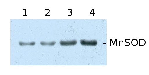 Additional information: Freshly prepared reducing agent like DTT needs to be used in a sample buffer, Otherwise MnSOD will migrate at 50 kDa