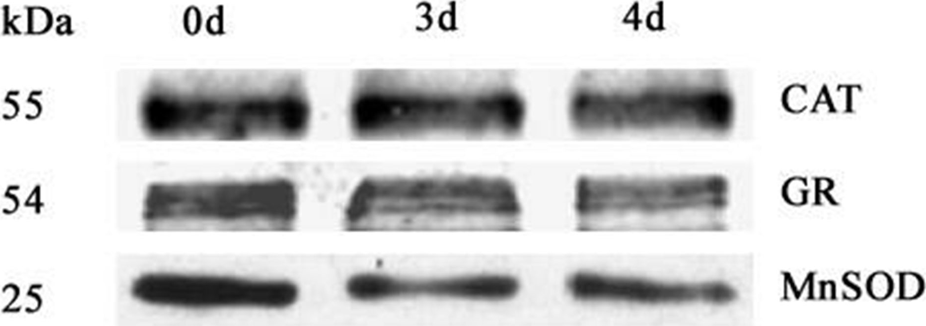Western blot analysis of antioxidant enzymes in purified mitochondria from 0 d, 3 d, and 4 d aged seeds.Total 10 ?g protein was separated by SDS gel electrophoresis and blotted to supported polyvinylidene difluoride, then probed with antibodies against catalase (CAT), glutathione reductase (GR) and manganese superoxide dismutase (MnSOD).