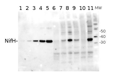 | Not reactive in: | Synechococcus sp. PCC 7942 and Synechocystis sp. PCC 6803 as NifH protein is not present in those cyanobacterial species, Frankia sp. |