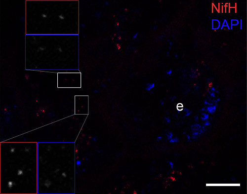 Total Trichodesmium sp. protein extract (lanes 6-11, 80 pmol chlorophyll loaded) extracted with PEB (AS08 300), and NifH protein standard (lanes 1-5, 0.05, 0.1, 0.3 0.75 and 1.5 pmol standard loaded) were separated on 4-12% NuPage (Invitrogen) LDS-PAGE and blotted 1h to PVDF. Blots were blocked immediately following transfer in 2% blocking reagent in 20 mM Tris, 137 mM sodium chloride pH 7.6 with 0.1% (v/v) Tween-20 (TBS-T) for 1h at room temperature with agitation. Blots were incubated in the primary antibody at a dilution of 1:40 000 for 1h at room temperature with agitation. The antibody solution was decanted and the blot was rinsed briefly twice, then washed once for 15 min and 3 times for 5 min in TBS-T at room temperature with agitation. Blots were incubated in secondary antibody (anti-hen IgY horse radish peroxidase conjugated) diluted to 1:50 000 in 2% blocking solution for 1h at room temperature with agitation. The blots were washed as above and developed for 5 min with chemiluminescent detection reagent according the manufacturers instructions. Images of the blots were obtained using a CCD imager (FluorSMax, Bio-Rad) and Quantity One software (Bio-Rad). Immunofluorescence image confirming the NifH protein (bright red dots) close to the cuticle of the ileum and covering or being directly adjacent to the bacterial DNA signals (blue dots: stained by DAPI). The host DNA of the epithelium (e) was also visible. The inset frames show magnifications of red stained dots representing NifH and DAPI signals. Scale bar is10 µm. Courtesy of Dr. Panagiotis Sapountzis, Center for Social Evolution University of Copenhagen, Danmark | |