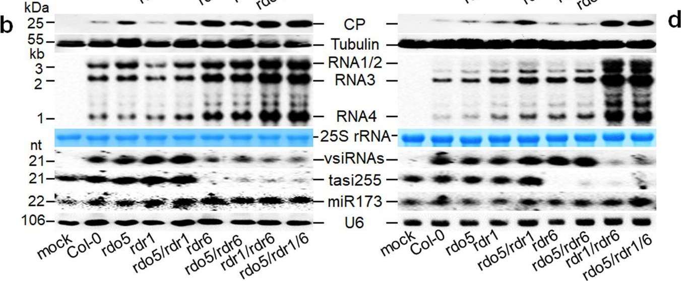 | Application examples: | Reactant: Virus Application: Western Blotting Pudmed ID: 35637208 Journal: Nat Commun Figure Number: 2B,D Published Date: 2022-05-30 First Author: Liu, S. Impact Factor: 15.405 Open PublicationRDO5 promotes antiviral RNAi.a–h Accumulation of CMV-∆2b (a, b, e, f) or CMV-2aT∆2b (a, d, g, h) detected in wild-type (Col-0), single, double or triple mutant plants as indicated at 2 weeks post-infection by ELISA (a, e, g) and Western blot analysis of the viral coat protein (CP) or Northern blot analysis of the viral RNAs 1-4 (b, d, f, h). Detection of the vsiRNAs and plant endogenous small RNAs (b, d), and the calculation of vsiRNAs/gRNAs ratios (c) were as described in the legend to Fig. 1. Note the reduced sample loading (to ½) for total proteins and total RNAs (f) from ago1/2 double mutant plants and rdo5/ago1/2 triple mutant plants infected with CMV-∆2b. Data presented are means ± SEM from three replicates (a, e, g) or independent experiments (c), letters indicate groups with significant differences (one-way ANOVA, Duncan, p < 0.05) and black dots represent the individual values. The experiments in (b), (d), (f) and (h) were repeated three times independently with similar results. The source data underlying blots in (b), (d), (f) and (h), ELISA data in (a), (e) and (g), and ratio data in (c) are provided as a Source Data file. |