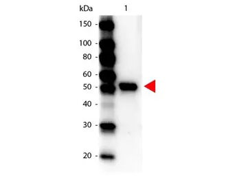 Western Blot of Peroxidase conjugated Rabbit anti-Carboxypeptidase Y Antibody (GTX40574). Lane 1: Carboxypeptidase Y. Lane 2: none. Load: 100 ng per lane. Primary antibody: none. Secondary antibody: Peroxidase rabbit Carboxypeptidase Y antibody at 1:1,000 for 60 min at RT Block for 30 min at RT. Predicted/Observed size: 53 kDa for Carboxypeptidase Y. Other band(s): none.