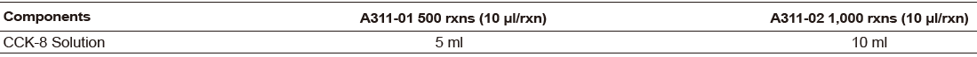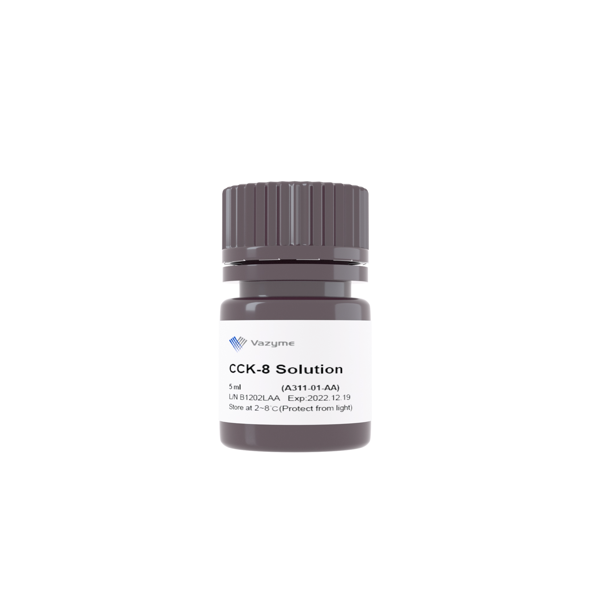 CCK-8 Cell Counting Kit is based on WST-8 [2-(2-methoxy-4-nitrophenyl)-3-(4-nitrophenyl)-5-(2,4-disulfophenyl)-2H-tetrazolium, monosodium salt] that is rapidly absorbing, highly sensitive and widely used in detection of cell proliferation and cytotoxicity. The amount of formazan dye generated by dehydrogenases in living cells is directly proportional to the number of living cells. Measure the Optical Density at 450 nm, using a microplate reader. The measurements can indirectly show the number of living cells. CCK-8 Cell Counting Kit contains CCK-8 Solution, which is a ready-to-use reagent. CCK-8 Solution can be directly added to cell samples. After Incubating the mixed solution for a certain period of time, the assay can be performed without preparing various components in advance.