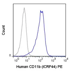 The ICRF44 antibody reacts with human CD11b, also known as integrin αalpha M. This 165-170 kDa cell surface glycoprotein is part of a family of integrin αreceptors that mediate adhesion between cells (cell-cell) and components of the extracellular matrix, e.g. fibrinogen (cell-matrix). In addition, integrin αs are active signaling receptors which recruit leukocytes to inflammatory sites and promote cell activation. Complete, functional integrin αreceptors consist of distinct combinations of integrin αchains which are differentially expressed. integrin αalpha M (CD11b) assembles with integrin αbeta-2 (CD18) into a receptor known as Macrophage Antigen-1 (Mac-1) or complement receptor type 3 (CR3). This receptor binds and induces intracellular signaling through ICAM-1, ICAM-2, ICAM-3 and ICAM-4 on endothelial cells and can also facilitate removal of iC3b bearing foreign cells.
