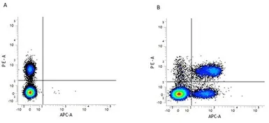 Figure A. RPE conjugated rat anti mouse CD4 (GTX43089) and APC conjugated Rat IgG2a isotype control. Figure B. RPE conjugated rat anti mouse CD4 (GTX43089) and APC conjugated rat anti mouse CD3 (GTX44015). All experiments performed on murine splenocytes.