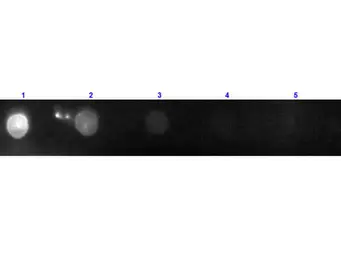Dot blot analysis of goat IgG using GTX27004 Donkey Anti-Goat IgG antibody, F(ab')2 fragment, pre-adsorbed (PE). Lane 1 : 100 ng Lane 2 : 33.3 ng Lane 3 : 11.1 ng Lane 4 : 3.7 ng Lane 5 : 1.23 ng Dilution : 1 μg/mL