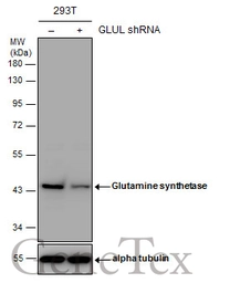 Non-transfected (–) and transfected (+) 293T whole cell extracts (30 μg) were separated by 10% SDS-PAGE, and the membrane was blotted with Glutamine synthetase antibody (GTX109121) diluted at 1:10000. The HRP-conjugated anti-rabbit IgG antibody (GTX213110-01) was used to detect the primary antibody.