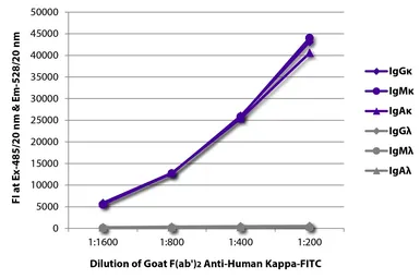 Goat Anti-Human kappa light chain antibody, F(ab')2 fragment, pre-adsorbed (FITC) Cat. No. GTX04131-06 Cat. No. GTX04131-06 GTX04131-06 ELISA Image ELISA analysis of purified human immunoglobulins using serially diluted GTX04131-06 Goat Anti-Human kappa light chain antibody, F(ab')2 fragment, pre-adsorbed (FITC). GTX04131-06 FCM Image FACS analysis of CD19+ human B-lymphocytes using Goat Anti-Human Lambda antibody, F(ab')2 fragment, pre-absorbed (PE) and GTX04131-06 Goat Anti-Human kappa light chain antibody, F(ab')2 fragment, pre-adsorbed (FITC). See all Human IgG products
