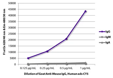 ELISA analysis of purified mouse IgG, IgM, IgA using GTX03670 Goat Anti-Mouse IgG antibody (Cy5), pre-adsorbed.
