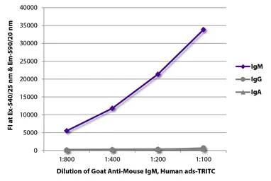ELISA analysis of purified mouse immunoglobulins using serially diluted GTX04192-25 Goat Anti-Mouse IgM (Mu chain) antibody, pre-adsorbed (TRITC).