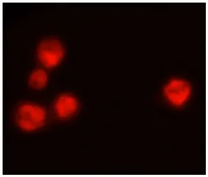 ICC/IF analysis of Wdpks1Δ-1 yeast cells treated with liquid nitrogen using melanin antibody followed by GTX04192-25 Goat Anti-Mouse IgM (Mu chain) antibody, pre-adsorbed (TRITC).