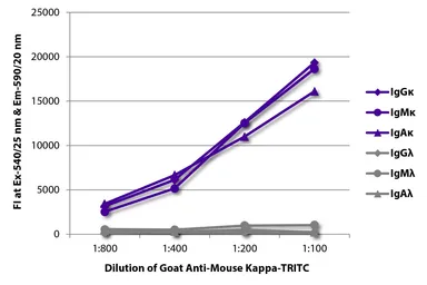 ELISA analysis of purified mouse immunoglobulins using serially diluted GTX04201-25 Goat Anti-Mouse kappa light chain antibody, pre-adsorbed (TRITC).