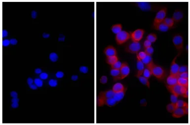 ICC/IF analysis of MIA PaCa-2 cells using Mouse Anti-Cytokeratin 18 antibody followed by GTX04201-25 Goat Anti-Mouse kappa light chain antibody, pre-adsorbed (TRITC).