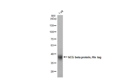 Sandwich ELISA detection of recombinant hCG beta protein, His tag (GTX138833-pro) using antibodies as below. Capture: hCG beta antibody [GT76] (GTX641721) (5 μg/mL) Detection: HRP-conjugated hCG beta antibody [GT75] (GTX641720) (1 μg/mL)Please notice that GTX641720 needs to be conjugated to HRP to function as the detection antibody when paired with GTX641721. Please contact us for custom HRP-conjugated antibody.