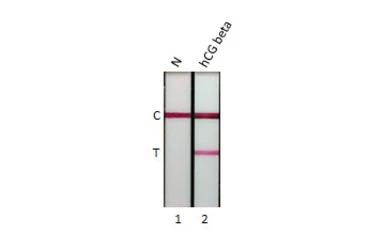 Detection of recombinant hCG beta protein by lateral flow assay using the monoclonal antibody pair. Capture: hCG beta antibody [GT76] (GTX641721) Detection: hCG beta antibody [GT75] (GTX641720) Samples (20 ng) : 1. Running buffer (N)2. hCG beta protein (GTX138833-pro)