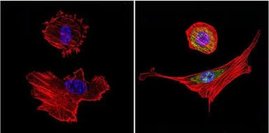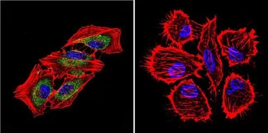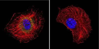 ICC/IF analysis of HeLa cells using GTX25442 Hsp70 antibody [2A4]. Cells were probed without (right) or with(left) an antibody.