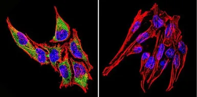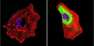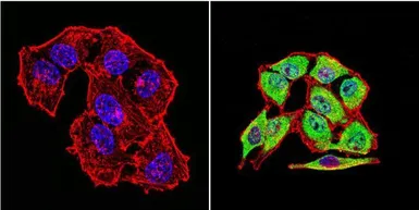 ICC/IF analysis of HeLa cells using GTX25442 Hsp70 antibody [2A4]. Cells were probed without (left) or with(right) an antibody.