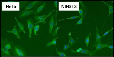 ICC/IF analysis of HeLa and NIH3T3 cells using GTX25442 Hsp70 antibody [2A4].