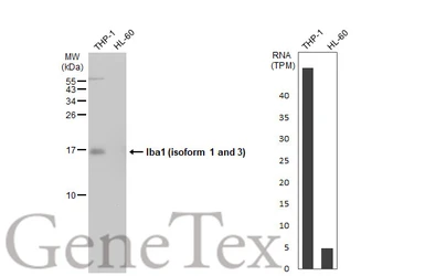 Various whole cell extracts (30 μg) were separated by 15% SDS-PAGE, and the membrane was blotted with Iba1 (isoform 1 and 3) antibody, C-term (GTX89792) diluted at 1:1000. The HRP-conjugated anti-rabbit IgG antibody (GTX213110-01) was used to detect the primary antibody. Corresponding RNA expression data for the same cell lines are based on Human Protein Atlas program.