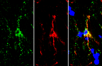 Iba1 (isoform 1 and 3) antibody, C-term detects Iba1 (isoform 1 and 3) protein by immunohistochemical analysis.Sample: Frozen-sectioned mouse brain.Green: Iba1 (isoform 1 and 3) stained by Iba1 (isoform 1 and 3) antibody, C-term (GTX89792) diluted at 1:250.Red: TMEM119, stained by TMEM119 antibody (GTX134087) diluted at 1:250.Blue: Hoechst 33342 staining.