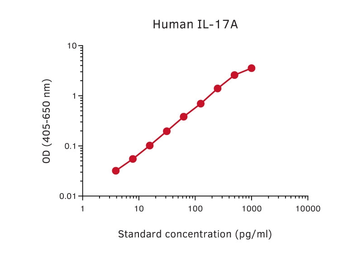 Sandwich ELISA analysis of human IL-17A protein using GTX02965 IL17A antibody [MT44.6] as coating antibody and GTX02966-02 IL17A antibody [MT504] (Biotin) as detecting antibody.