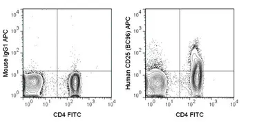 Right panel : co-stained with IL2 Receptor alpha antibody [BC96] (APC) and Human CD4 antibody (FITC)