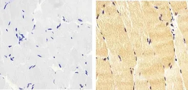 IHC-P analysis of human skeletal muscle tissue using GTX24868 IRS1 (phospho Tyr612) antibody. Right : Primary antibody Left : Negative control without primary antibody Antigen retrieval : 10mM sodium citrate (pH 6.0), microwaved for 8-15 min Dilution : 1:20