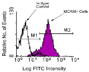 Thymocytes from a young chicken were isolated and incubated with MCAM monoclonal antibody, clone C264. The cells were then stained with goat anti-mouse IgG2b-FITC and analyzed on a FACScan™ flow cytometer (BDB, San Jose, CA).Immunoprecipitation