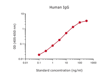 Sandwich ELISA analysis of human IgG protein using GTX03023 Human IgG antibody [MT91 + MT145] as coating antibody and GTX03022-02 Human IgG antibody [MT78 + MT145] (Biotin) as detecting antibody.