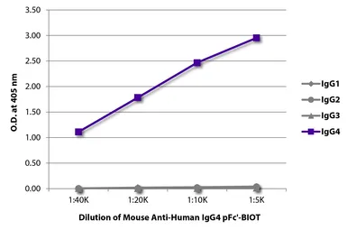 ELISA analysis of purified human immunoglobulins using serially diluted GTX04186-02 Mouse Anti-Human IgG4 (pFc') antibody [HP6023] (Biotin) followed by Streptavidin (HRP).