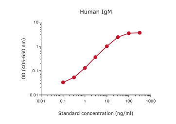 Sandwich ELISA analysis of human IgM protein using GTX03024 Human IgM antibody [MT11 + MT12] as coating antibody and GTX03025-02 Human IgM antibody [MT22] (Biotin) as detecting antibody.